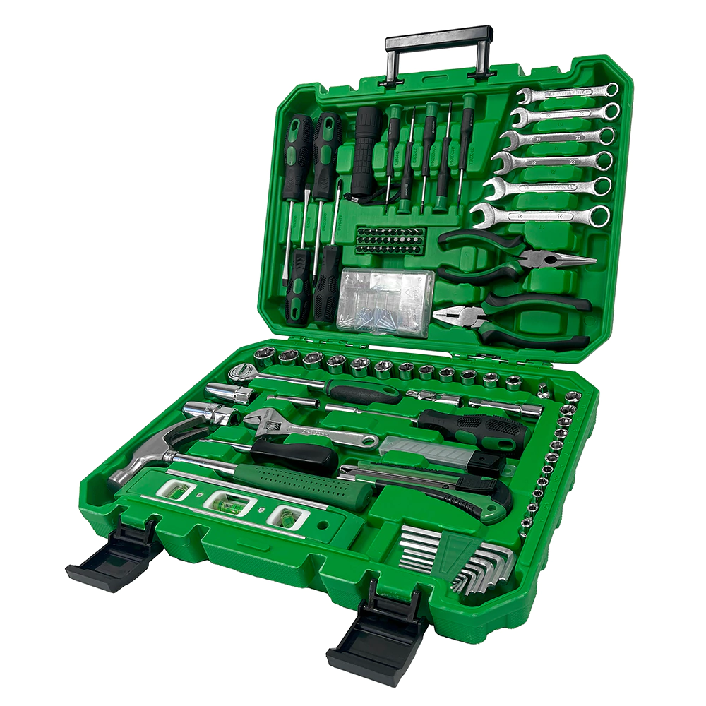 Ideal para mantenimiento, bricolaje, reparaciones mecánicas y tareas cotidianas. Incluye herramientas manuales, tubos, puntas, accesorios y elementos complementarios como linterna, nivelador y cutter.
